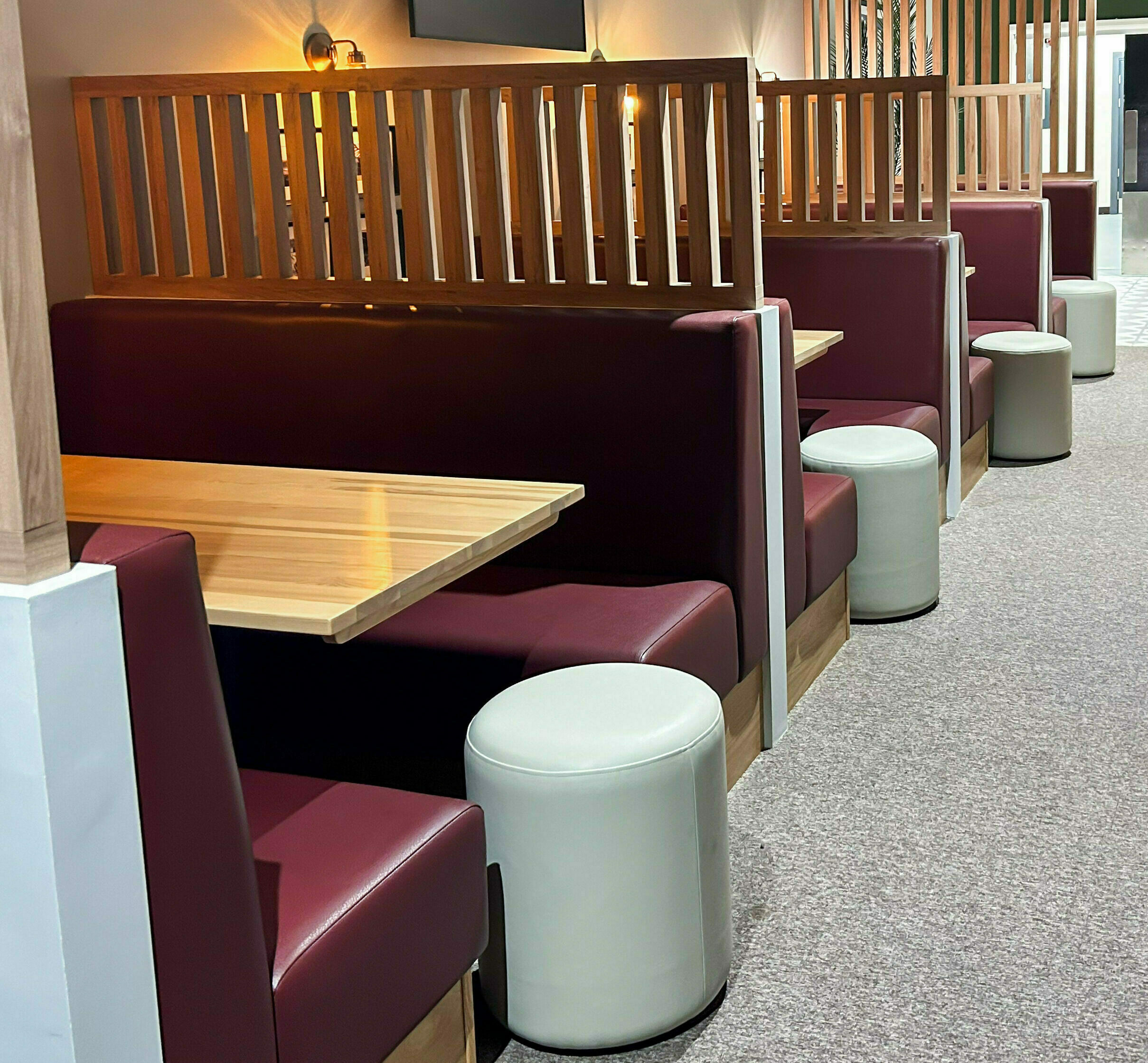 Guests can relax on our Meg Lounge Chairs, upholstered again in green and burgundy faux leather which works well with the natural finish on the chair’s solid beech legs. The same faux leathers are used to upholster our Agnes Sofas - supplied here in two- and three-seater versions.