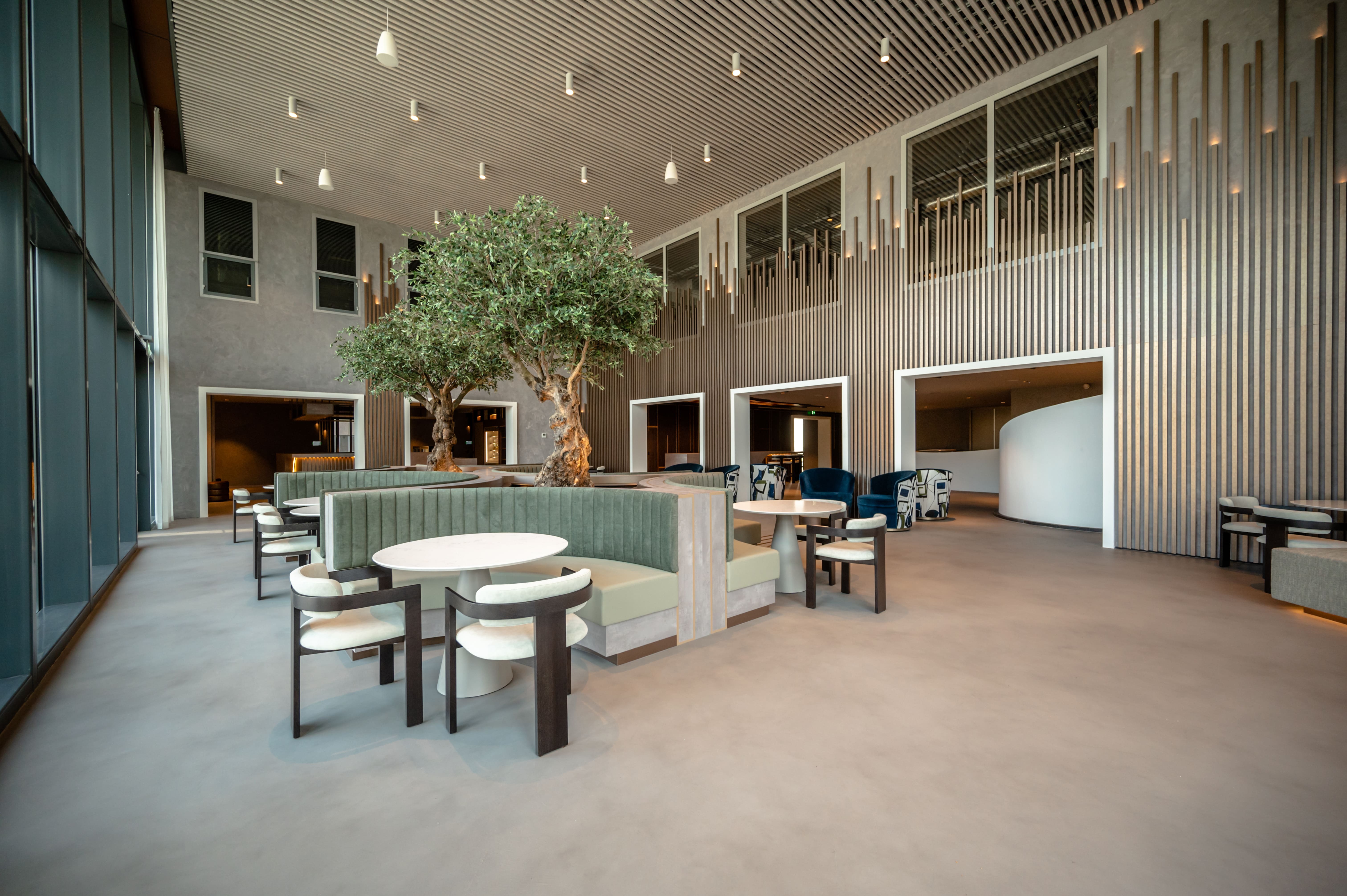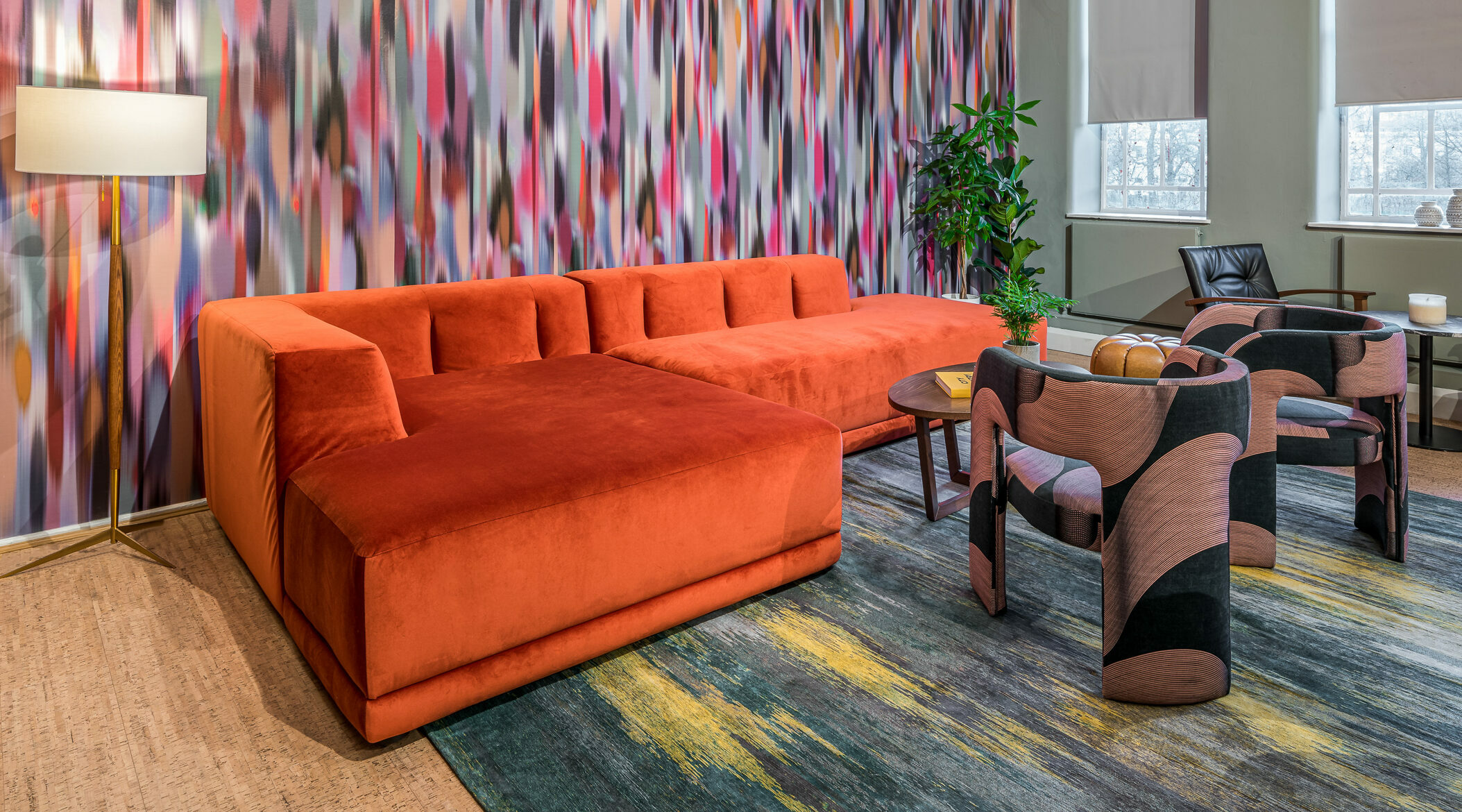 Elsewhere, a bespoke fixed seating unit, featuring white tiles and a sleek timber seat with a punchy orange upholstered back cushion, perfectly complements the space. Another unit showcases a brass-effect metal frame, deep blue tiles and a brass trim. Together with integrated planting and an oversized globe bulb, they create a semi-private space within the bustling environment.
