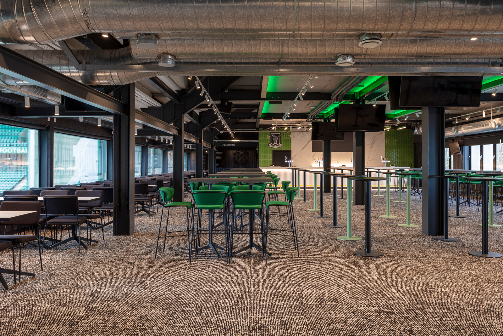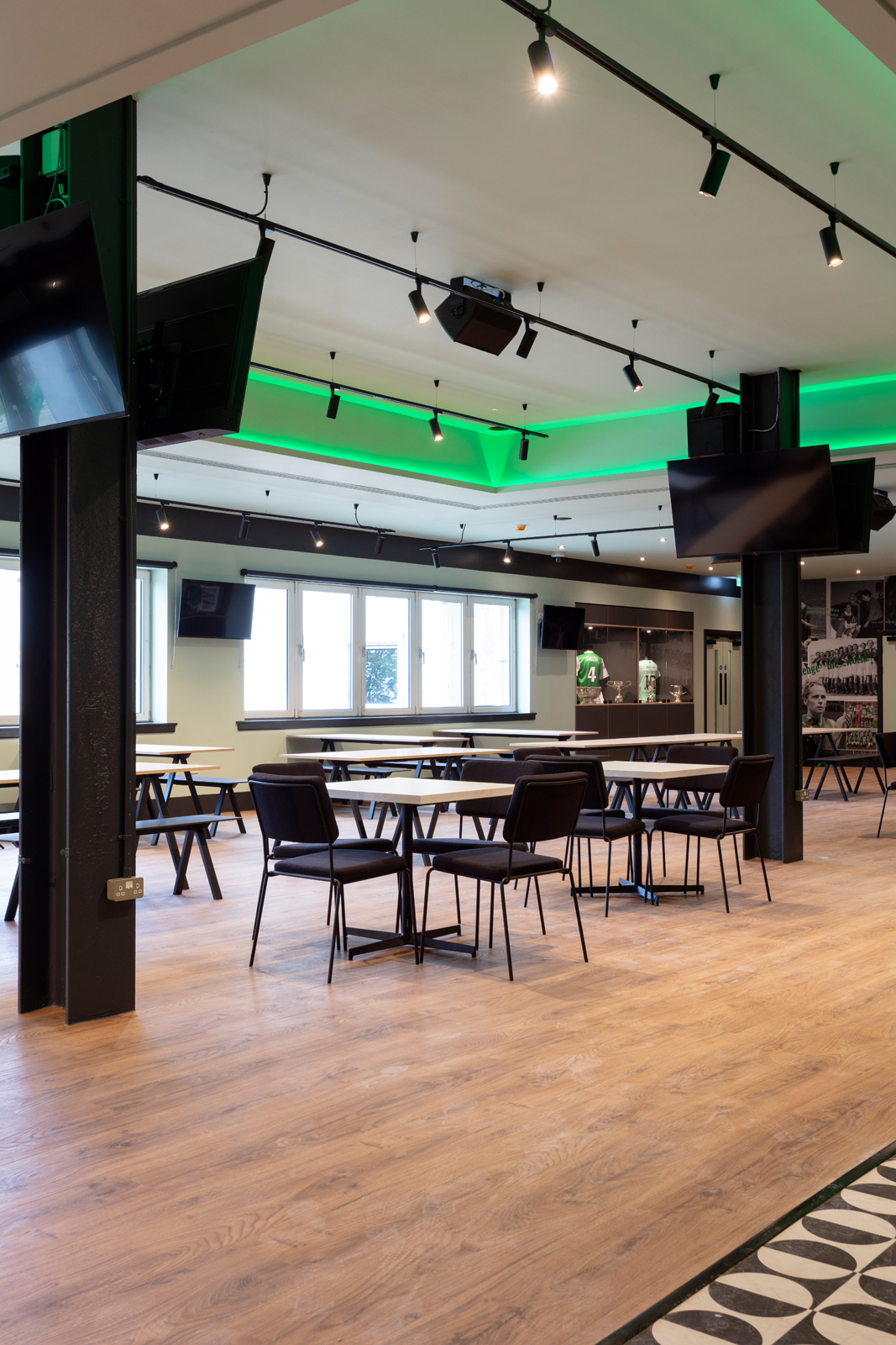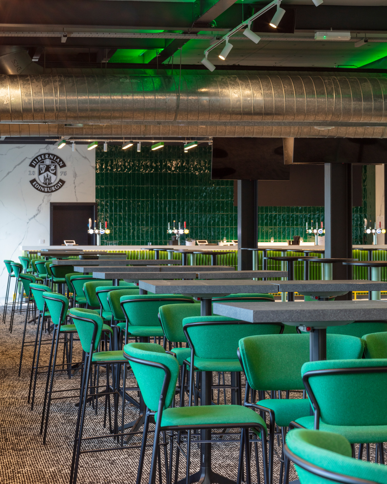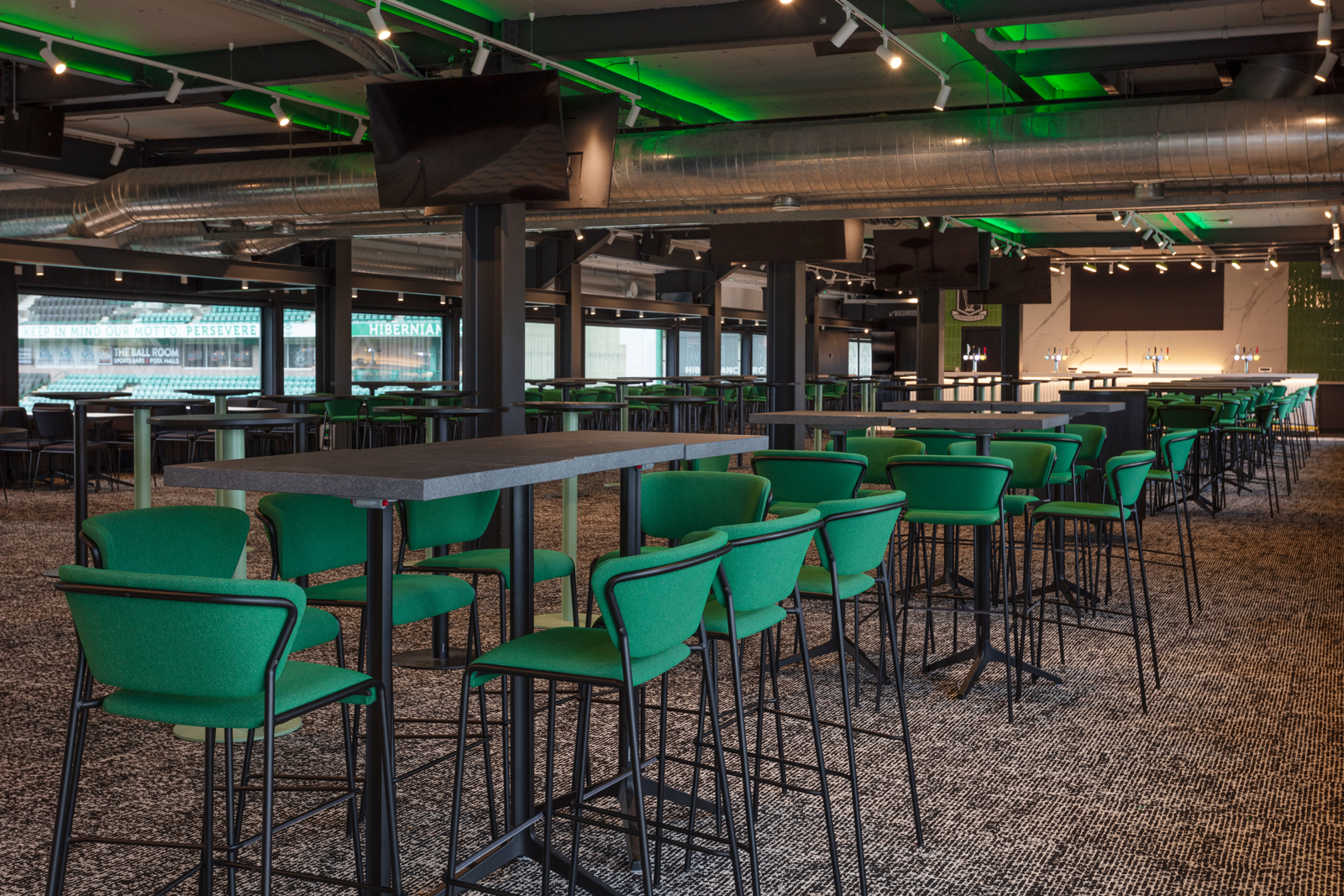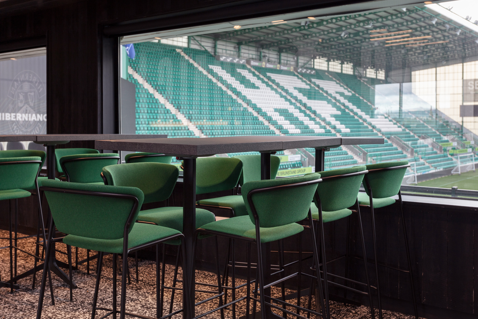 Located on the second floor of the club's Famous Five Stand - named after Hibs' most celebrated forward line - the hospitality lounge Behind The Goals offers a premium sports-bar setting for supporters to enjoy matches in style and comfort. It's also used for conferences and events throughout the year, so it was important that the furniture we supplied for this refurb could be easily reconfigured to suit different layouts.