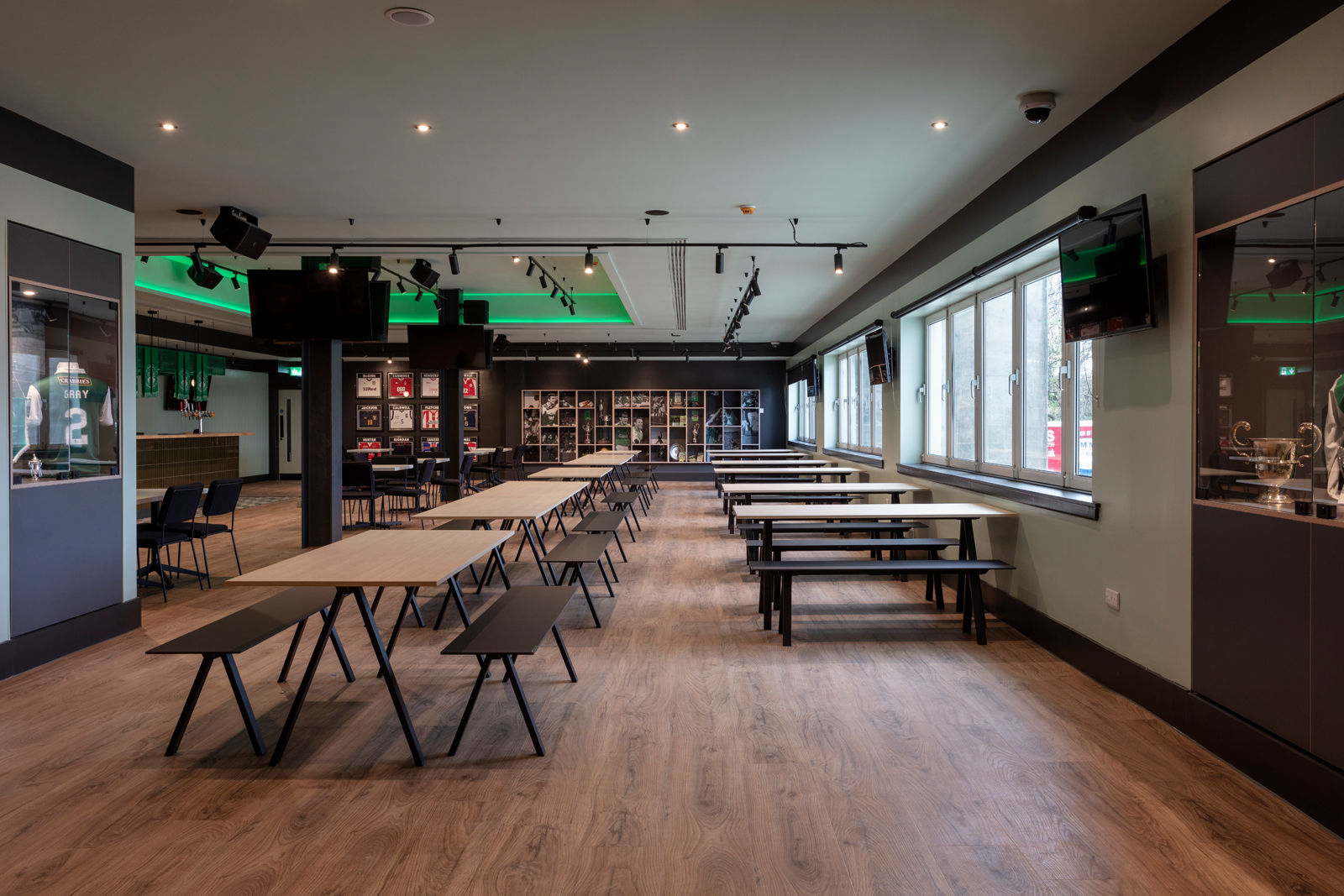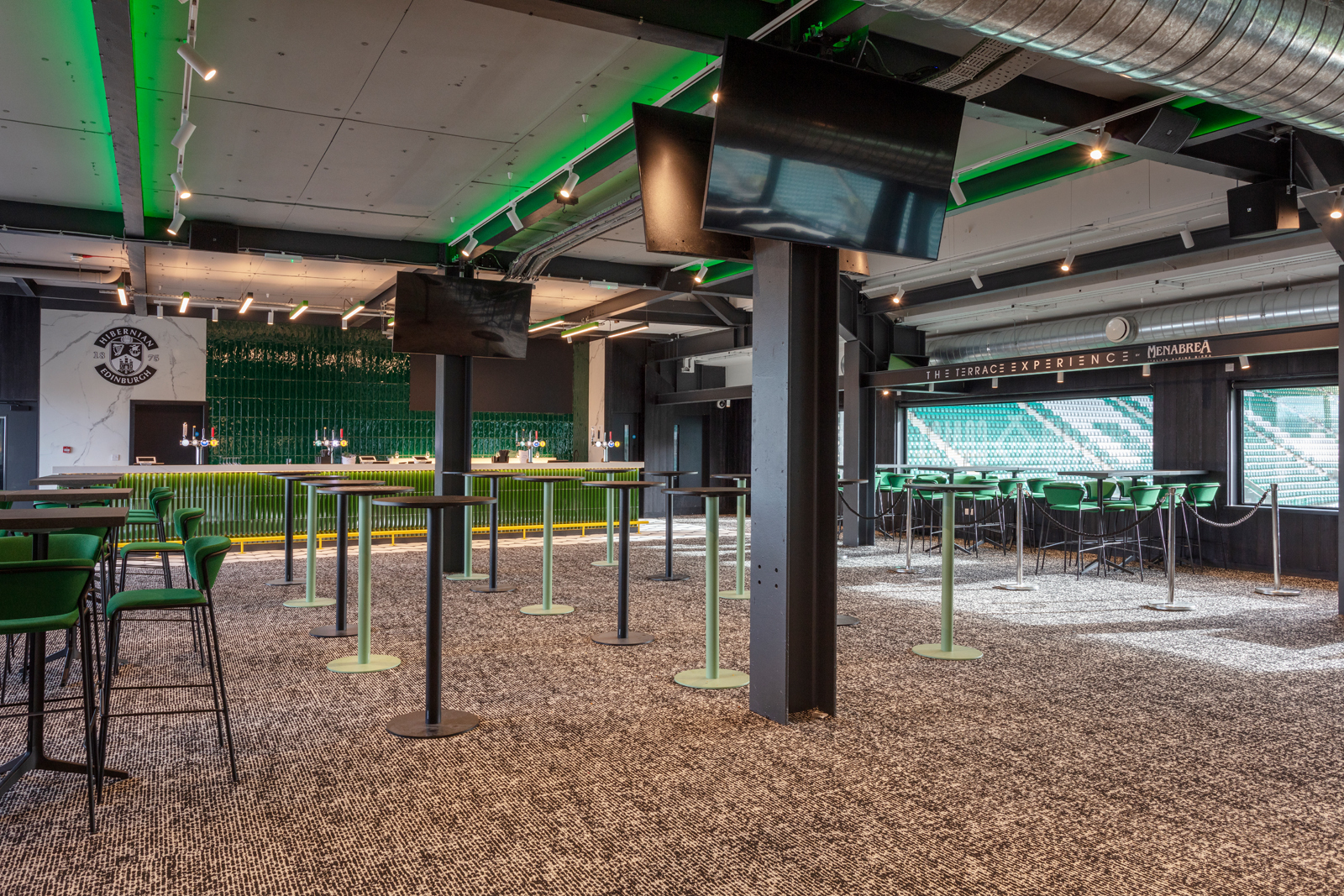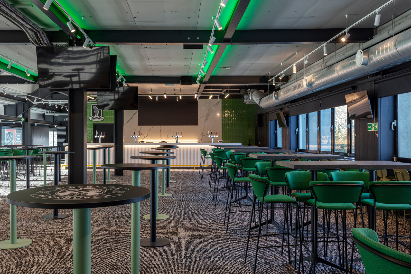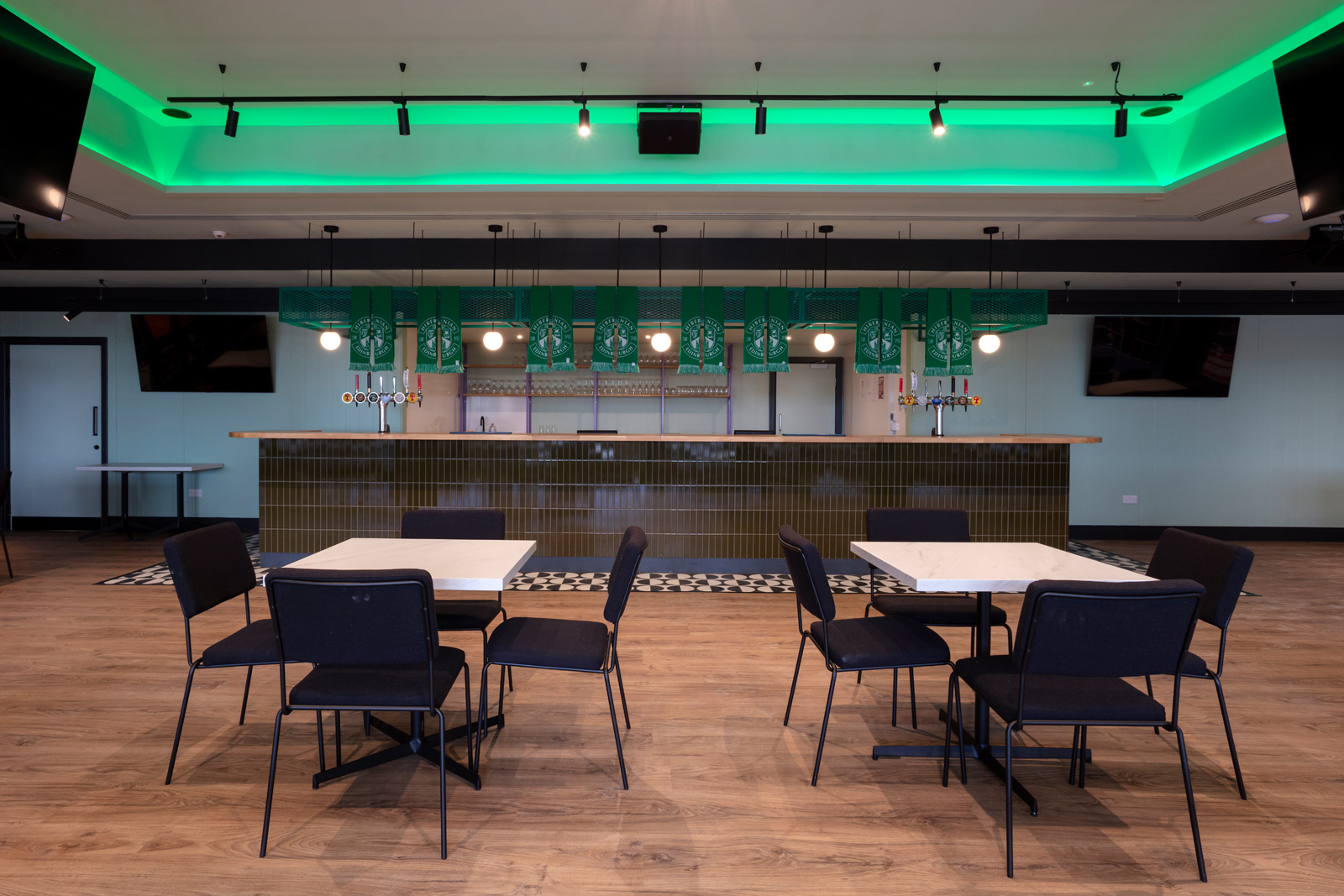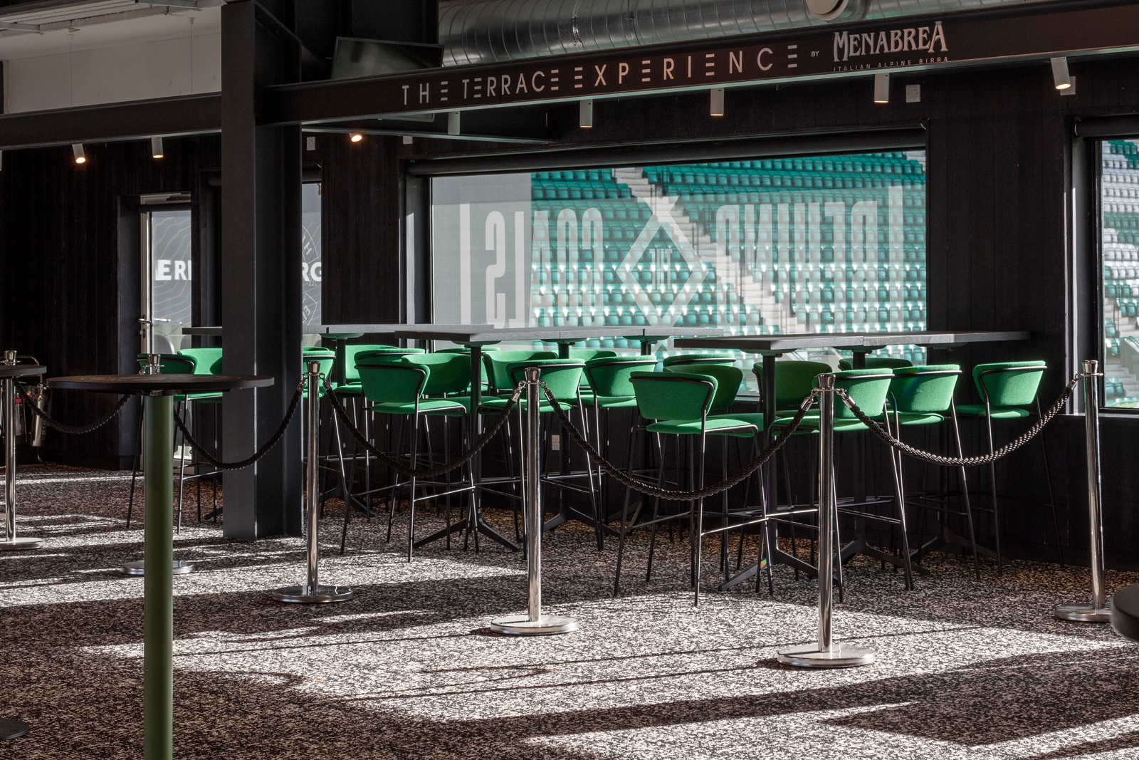 Located on the second floor of the club's Famous Five Stand - named after Hibs' most celebrated forward line - the hospitality lounge Behind The Goals offers a premium sports-bar setting for supporters to enjoy matches in style and comfort. It's also used for conferences and events throughout the year, so it was important that the furniture we supplied for this refurb could be easily reconfigured to suit different layouts.