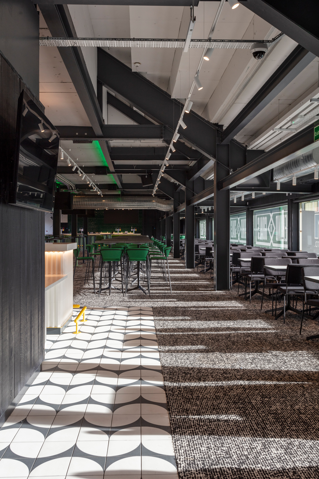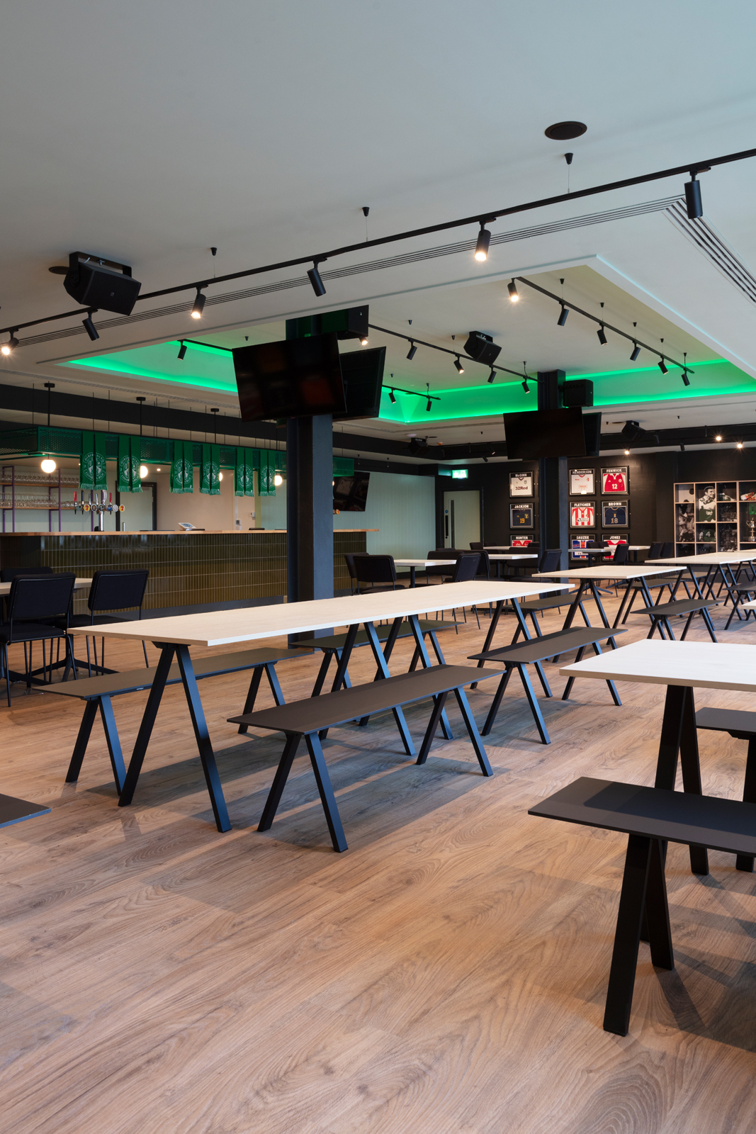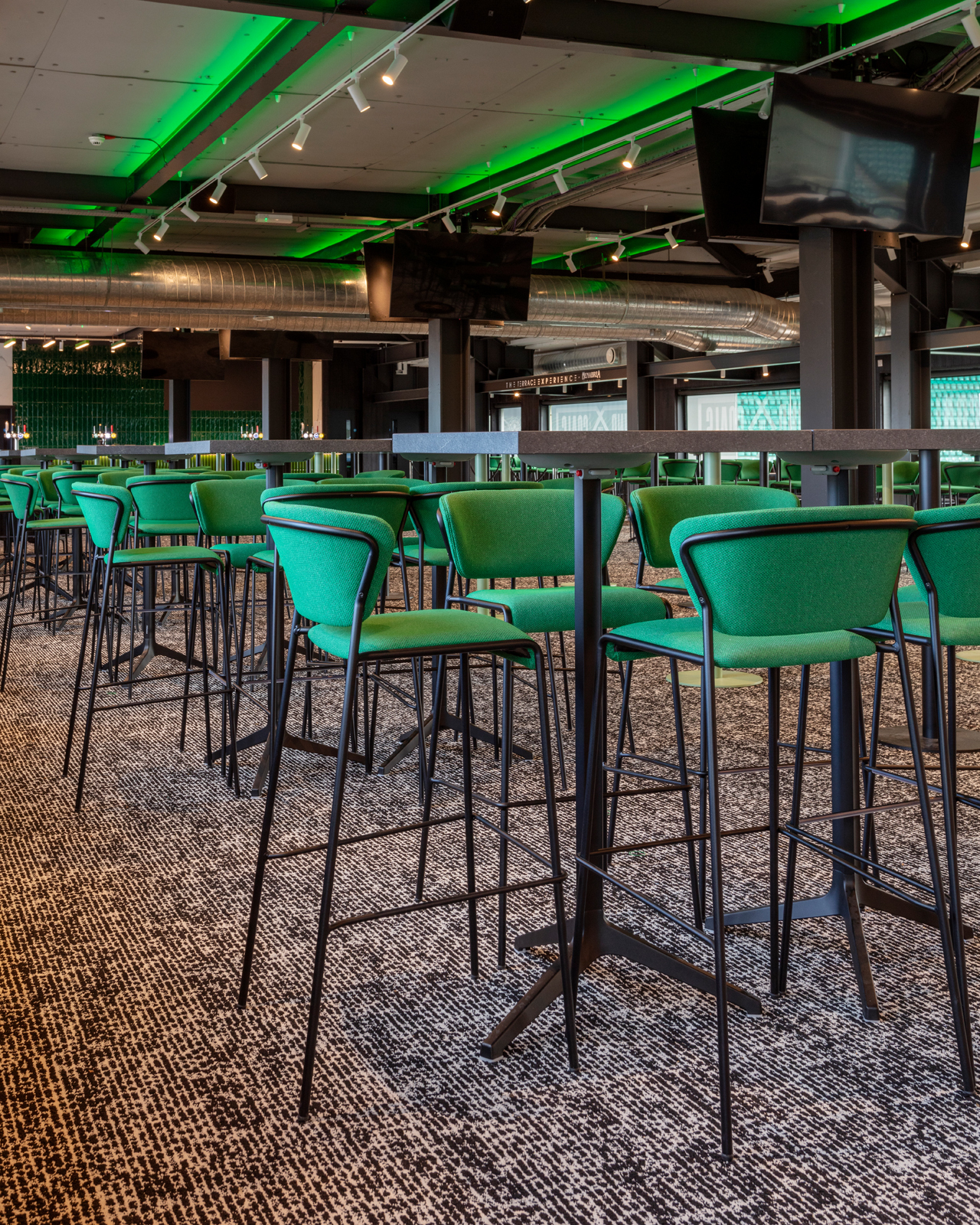 The best seats in the house of course have spectacular pitch views. For this prime spot, we supplied the Alexa Side Chair, a smart and stylish design that's also stackable. We upholstered it in a black-coloured Camira Flax fabric - a sustainable and heavy-duty wool and flax blend - and set it alongside marble-effect laminate tables as before, in a lower height.