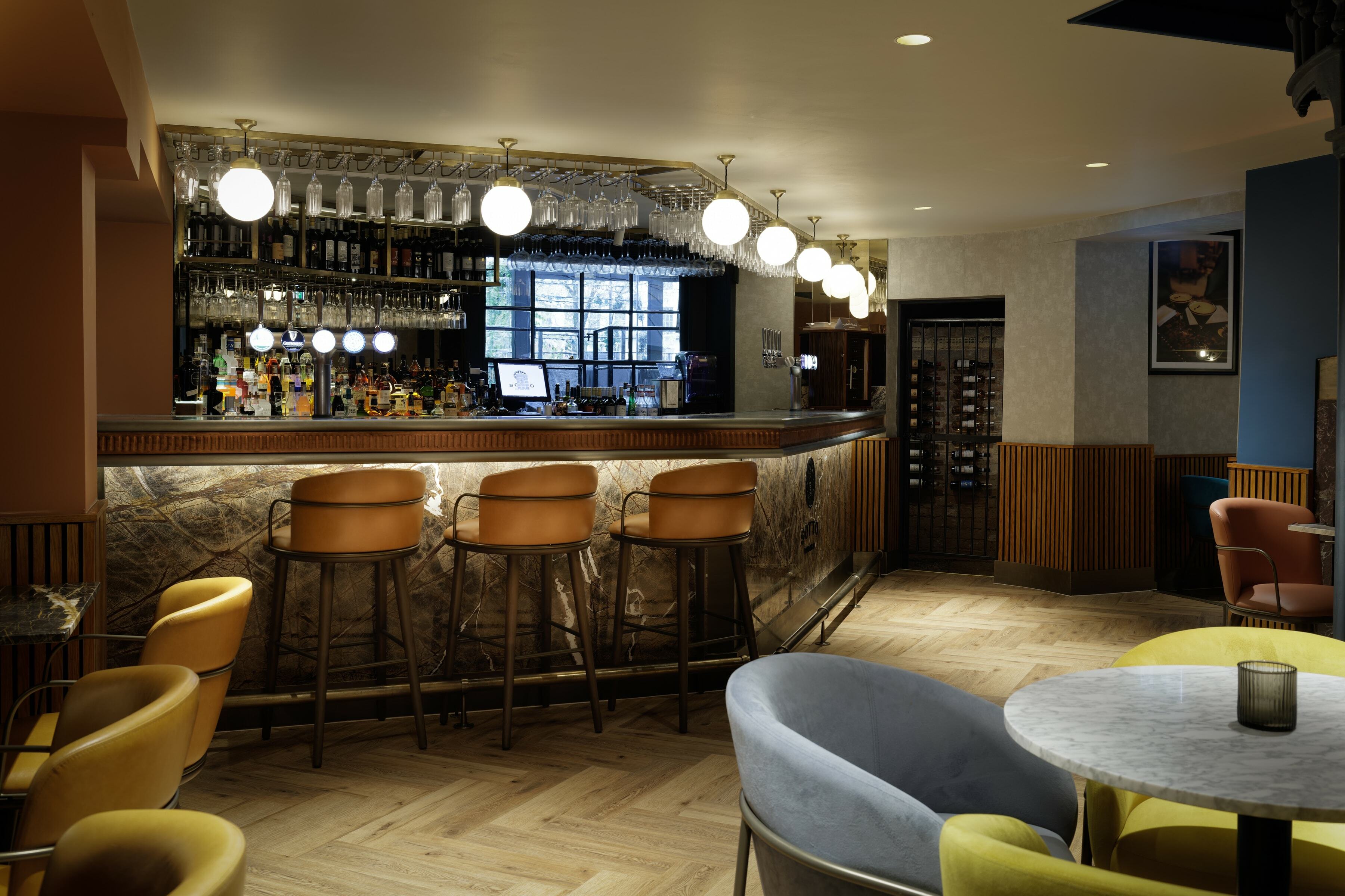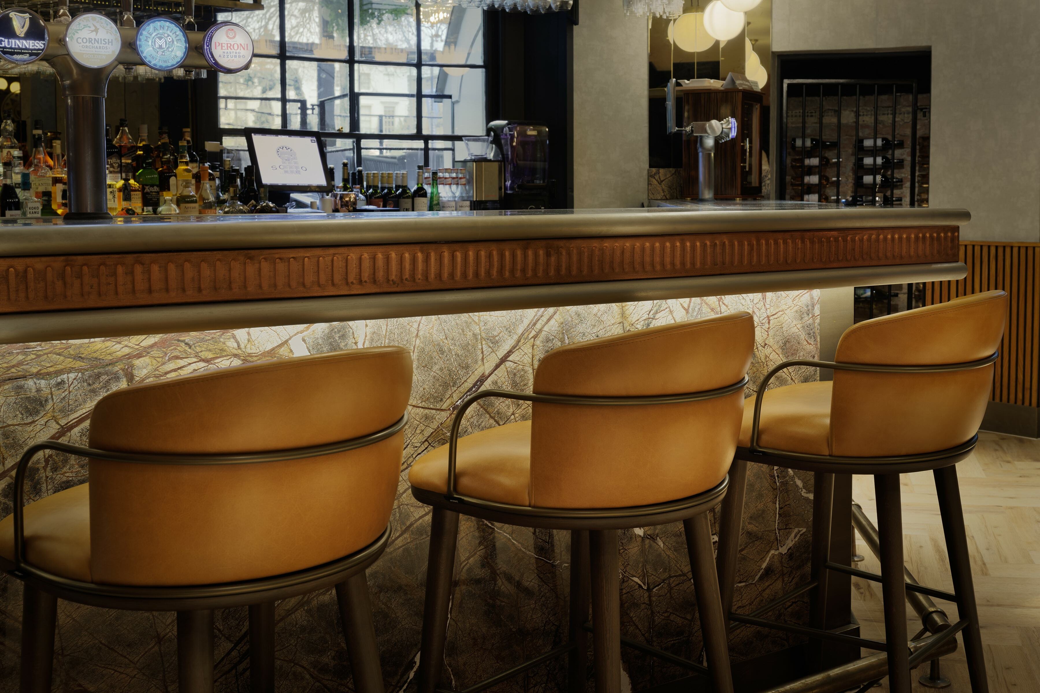 Down on the ground floor in Sotto, Settebello's chic cocktail bar, the Arven Bar Stool was an ideal choice with its contemporary design and unique metal armrests. Upholstered in a vintage-look leather, with mocha and truffle finishes to the frame, it goes perfectly with the bar's décor. For another section of the bar, we supplied the Arven Armchair, creating a cohesive look for this space and providing a comfy spot for a pre- or post-dinner drink.