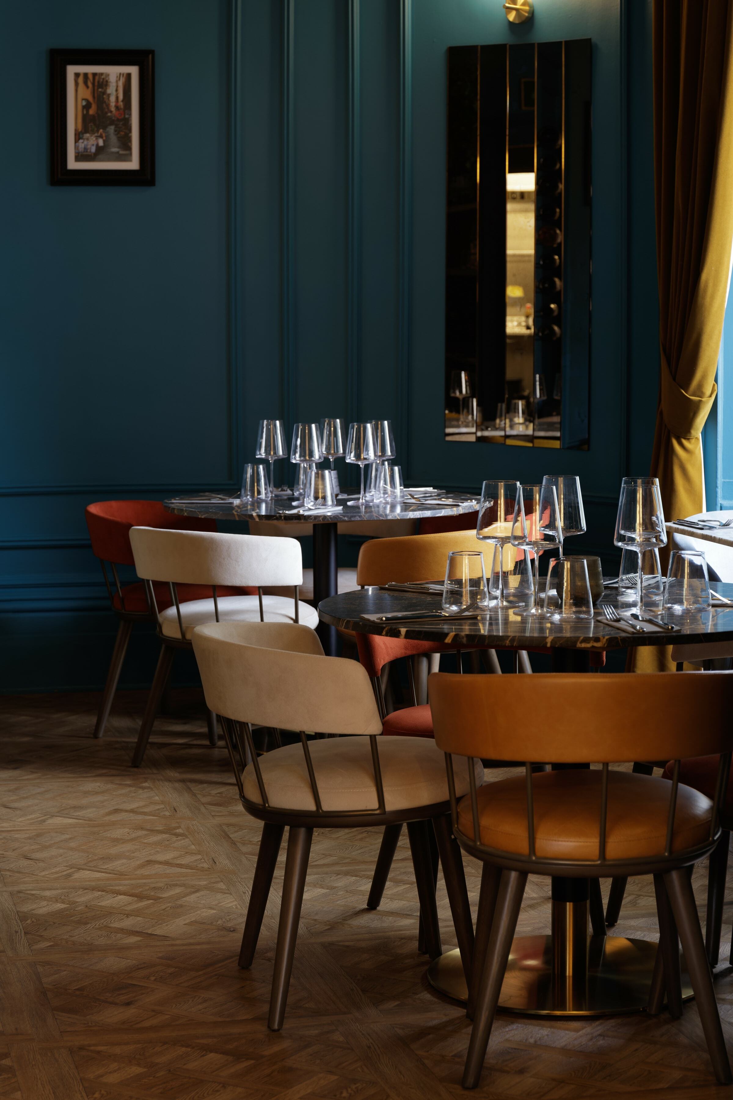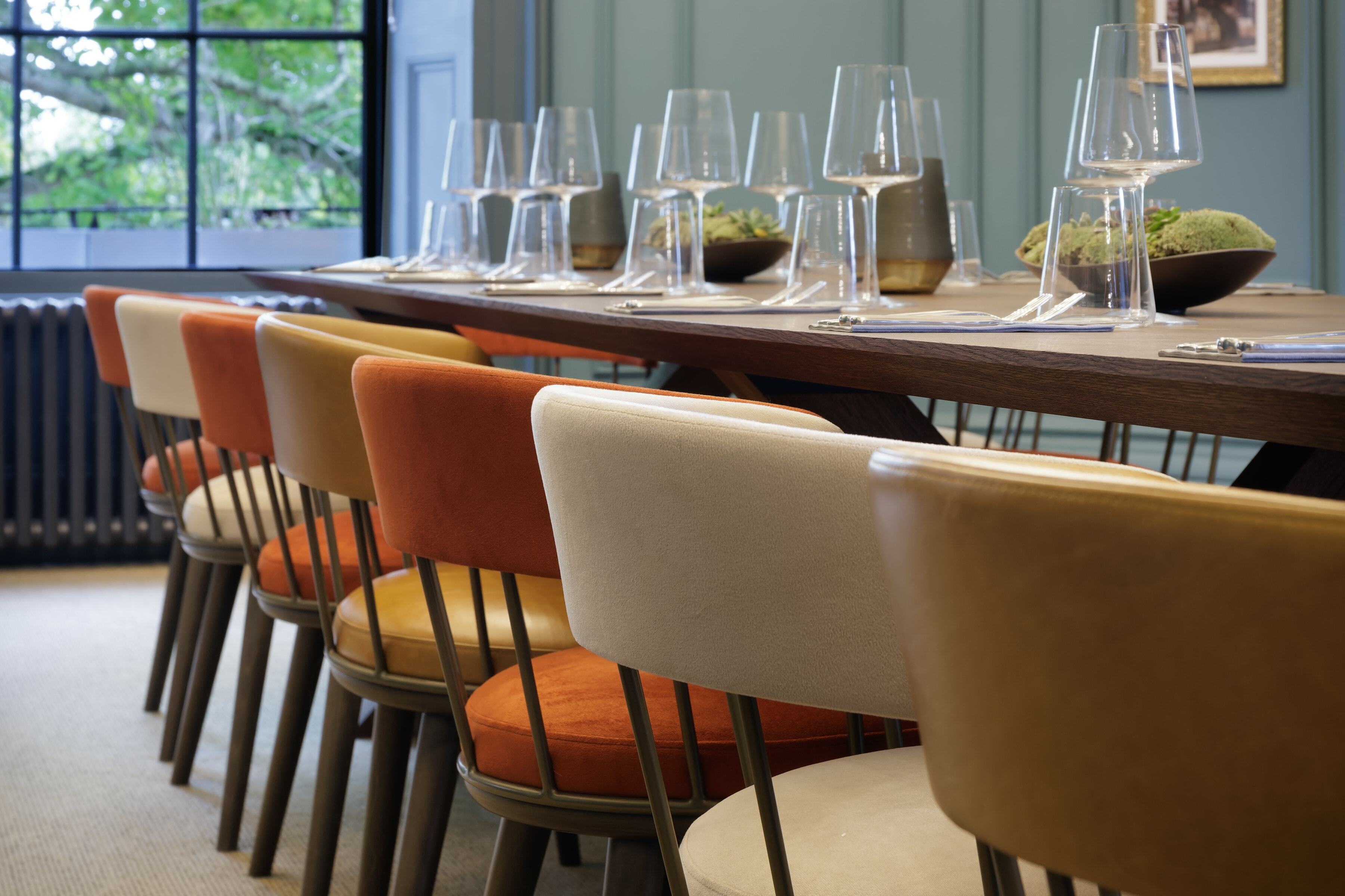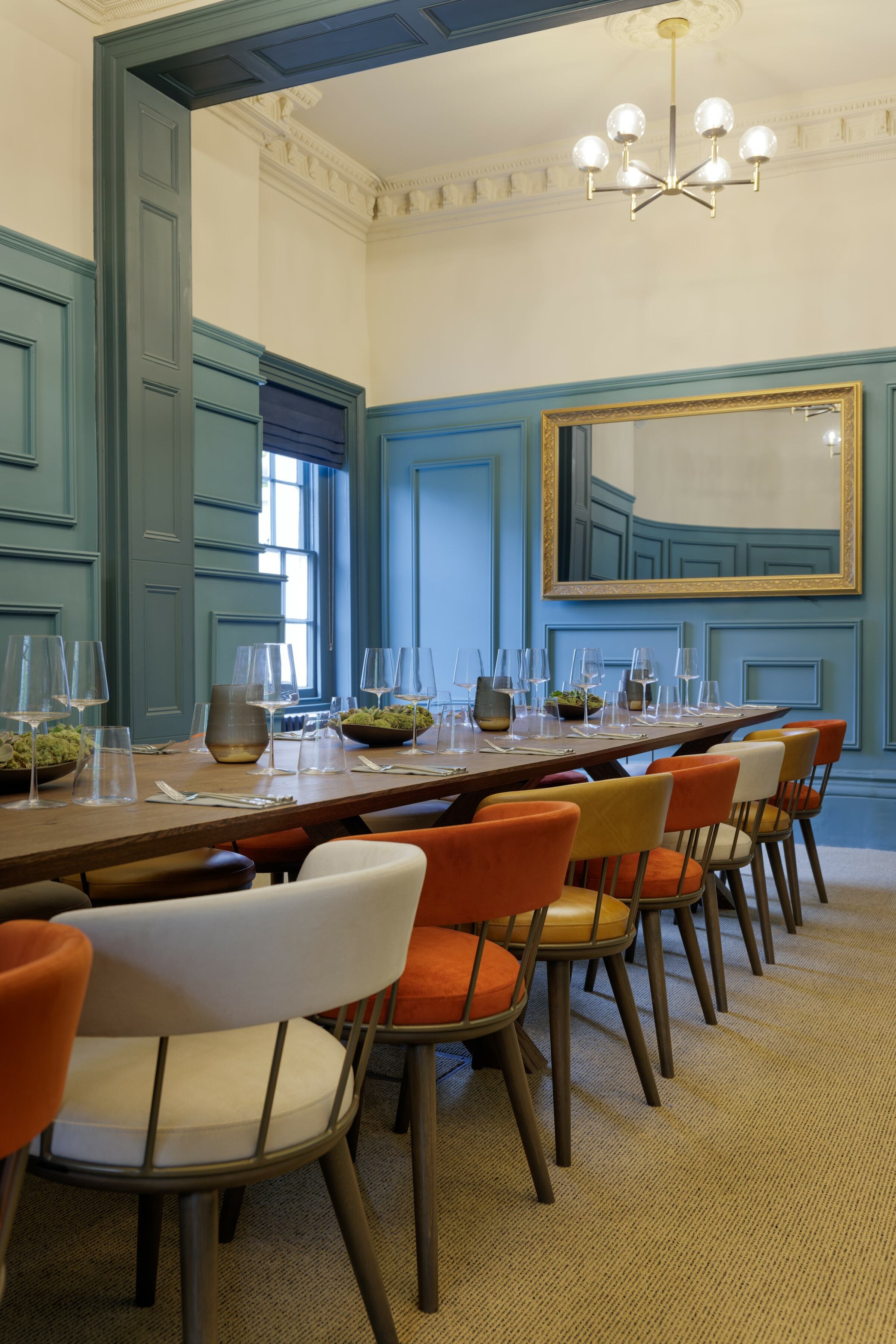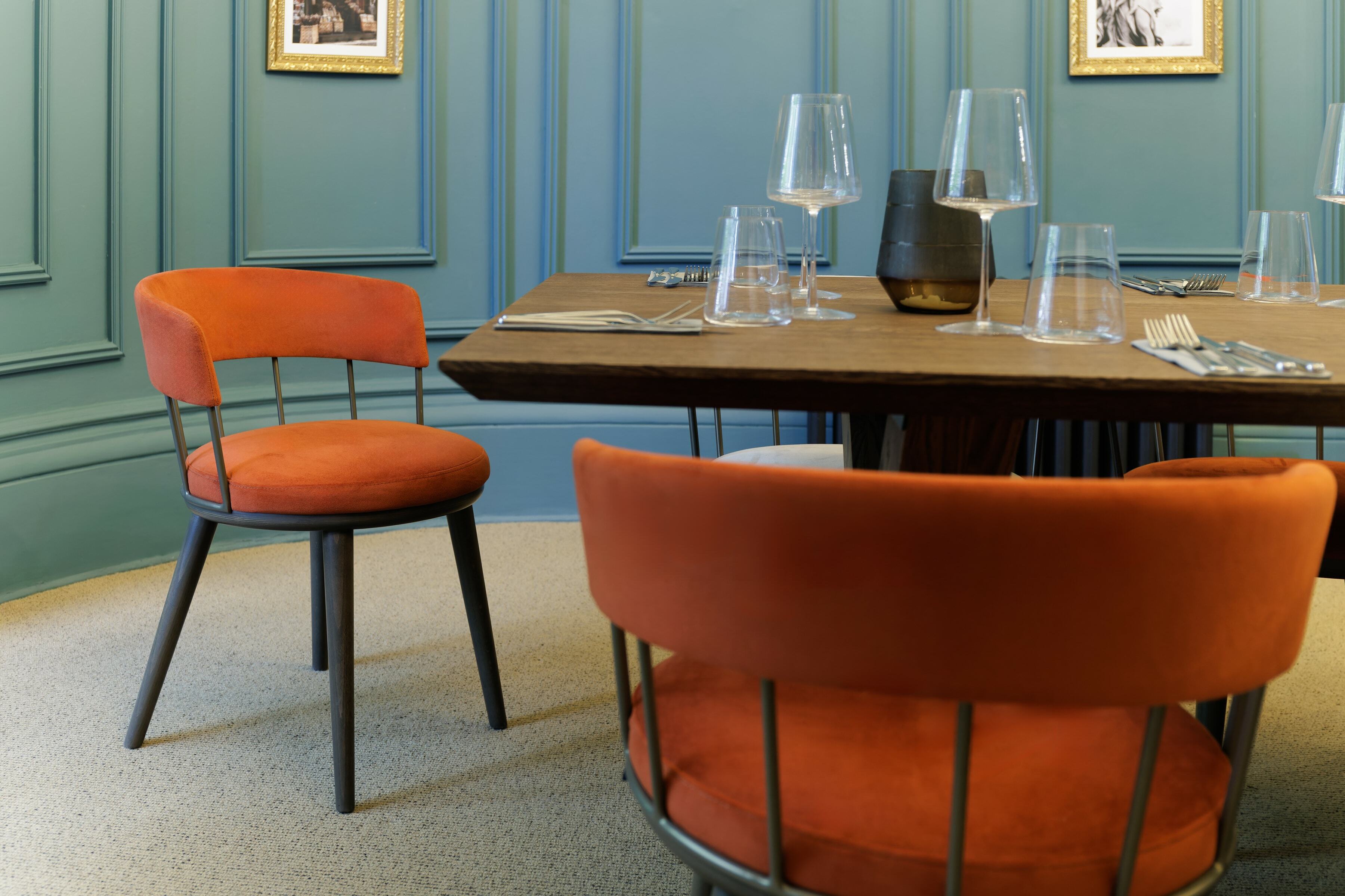 On the top floor is The Imperiale, a gorgeous private dining room which can also be used for meetings. For the long table, we placed our Meru Armchair as before in the same colour palette as the main dining space. It's a fantastic result against the backdrop of the blue walls.