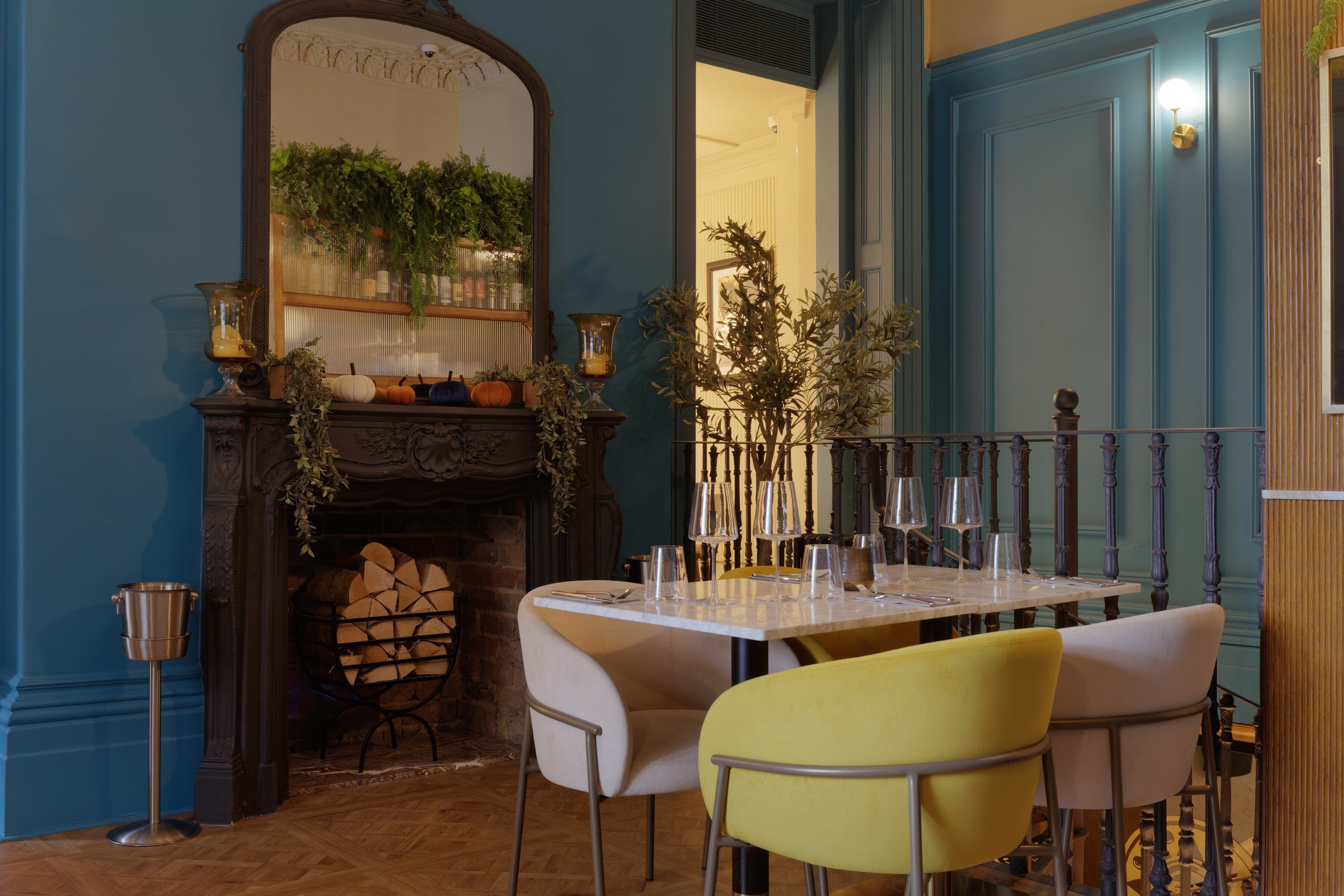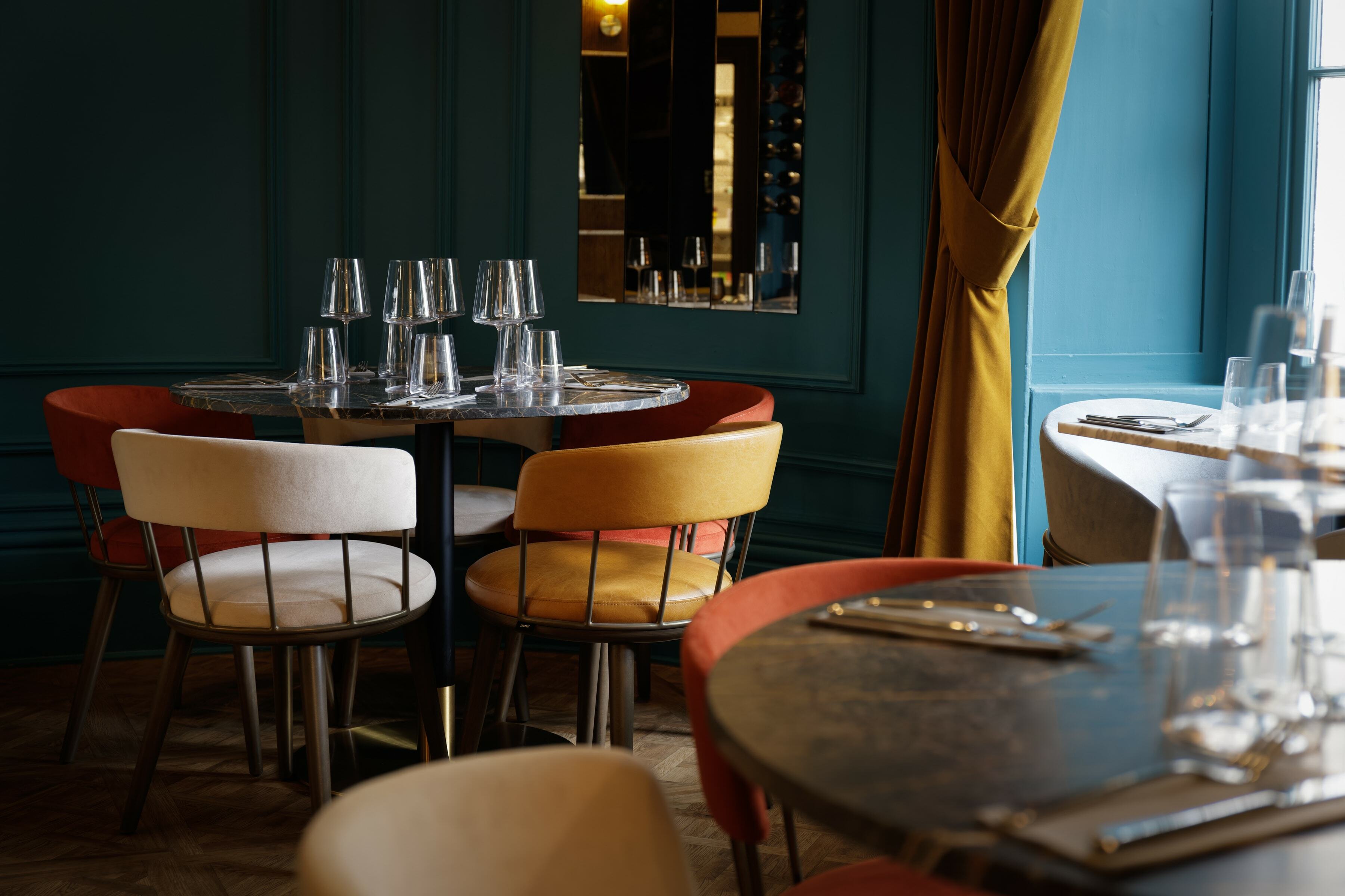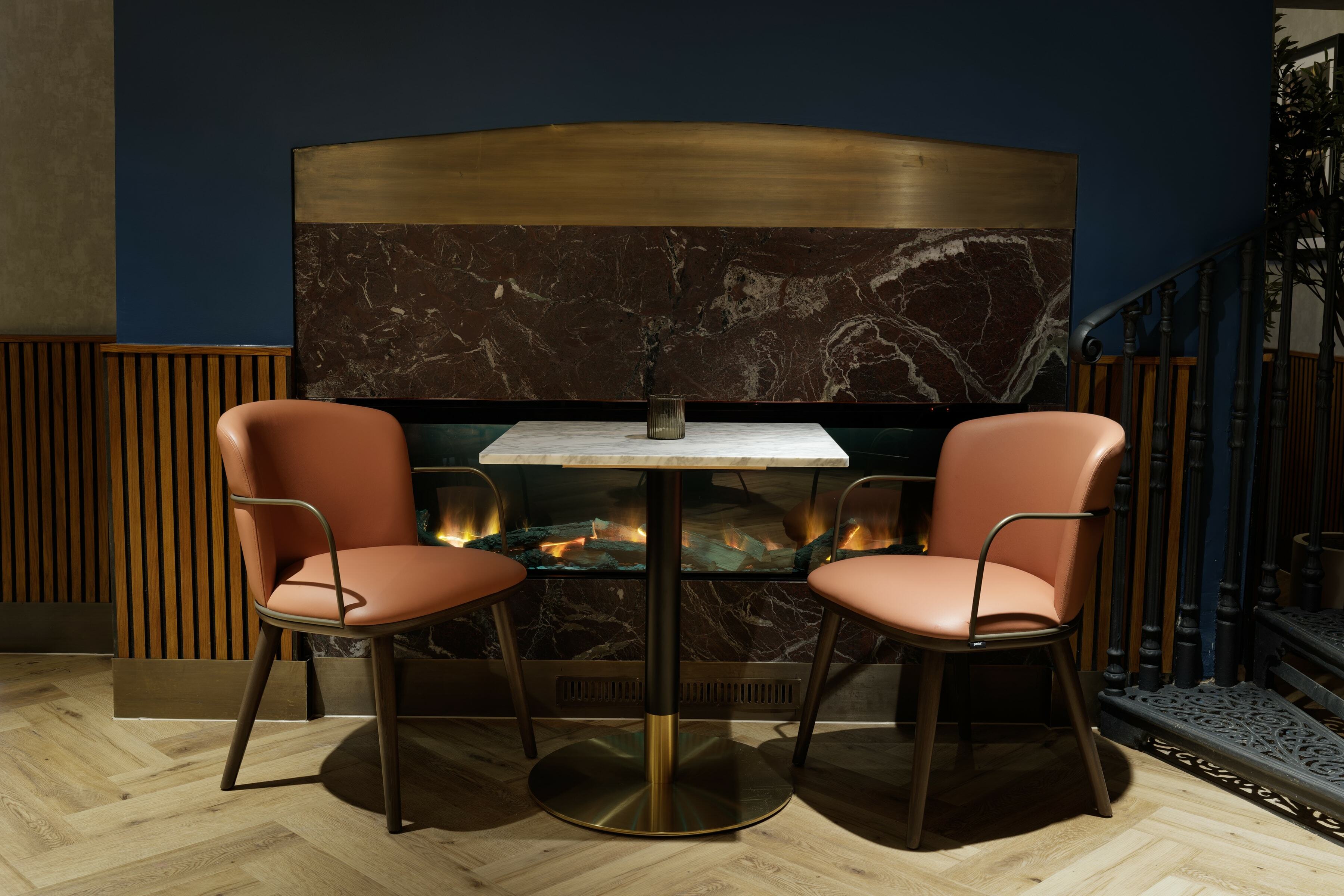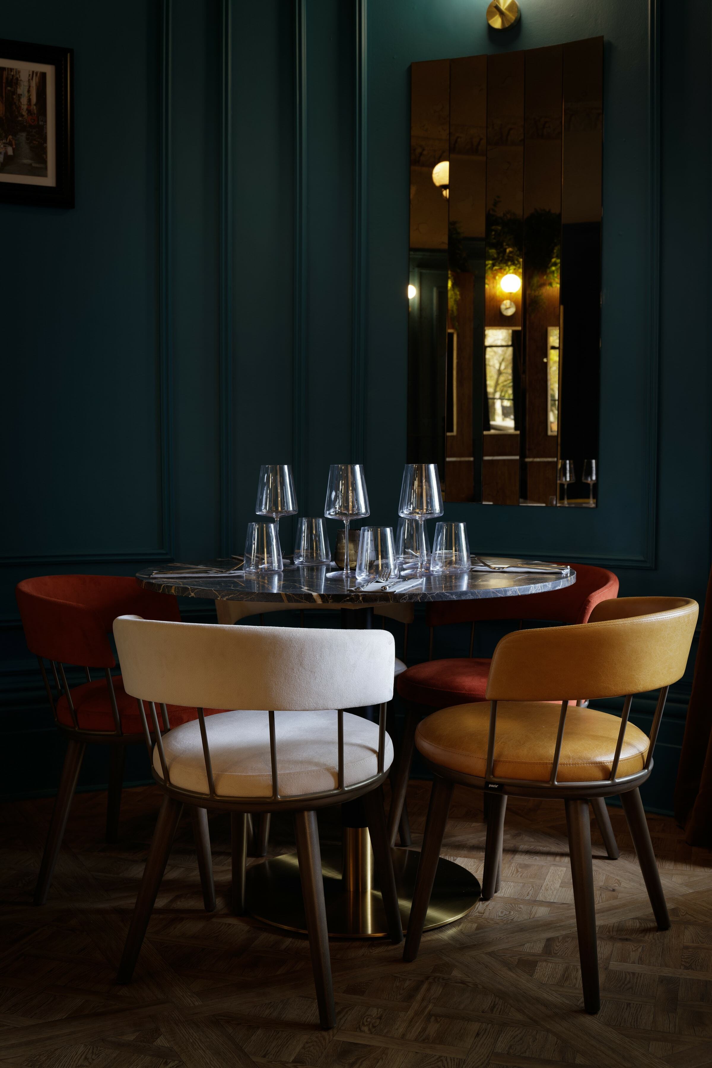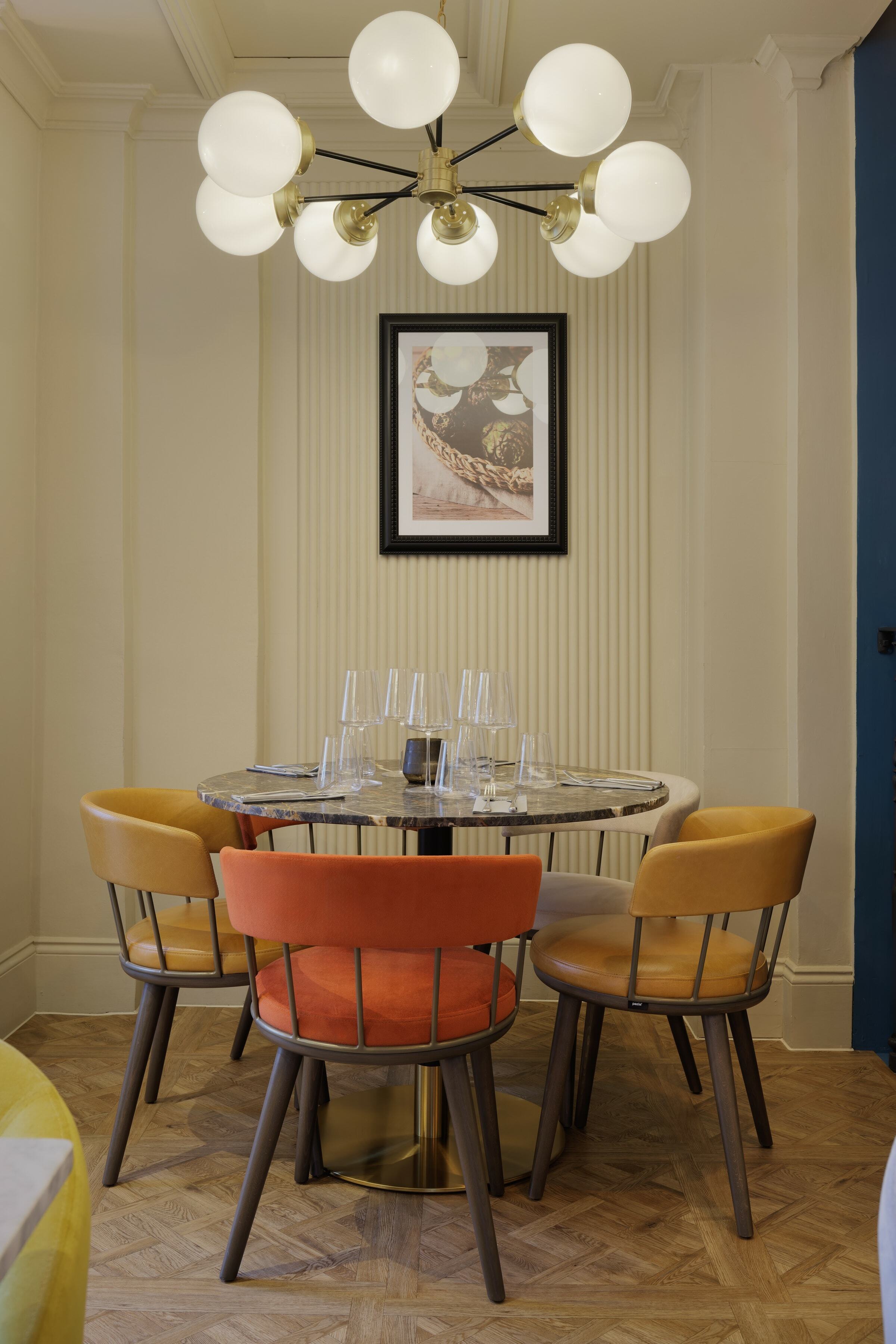 On the top floor is The Imperiale, a gorgeous private dining room which can also be used for meetings. For the long table, we placed our Meru Armchair as before in the same colour palette as the main dining space. It's a fantastic result against the backdrop of the blue walls.