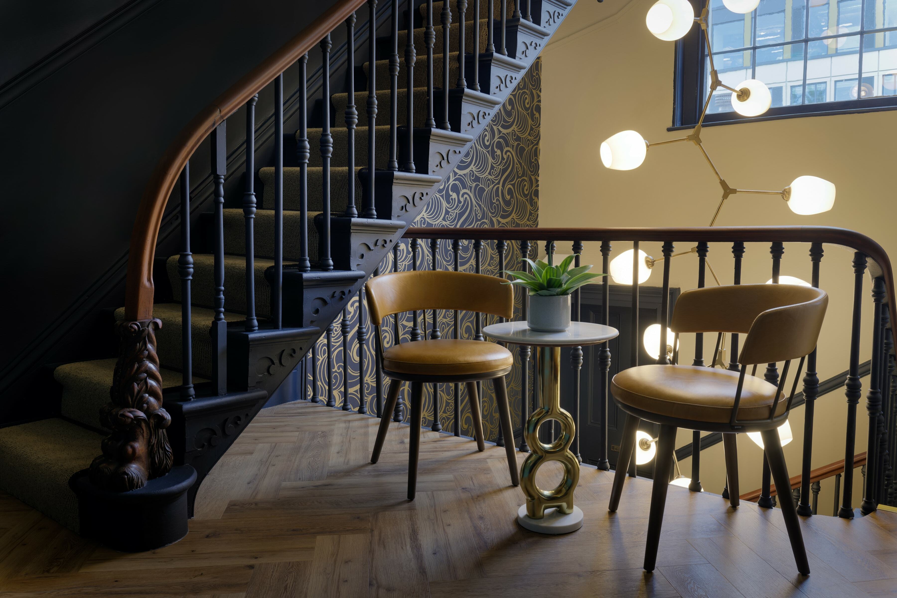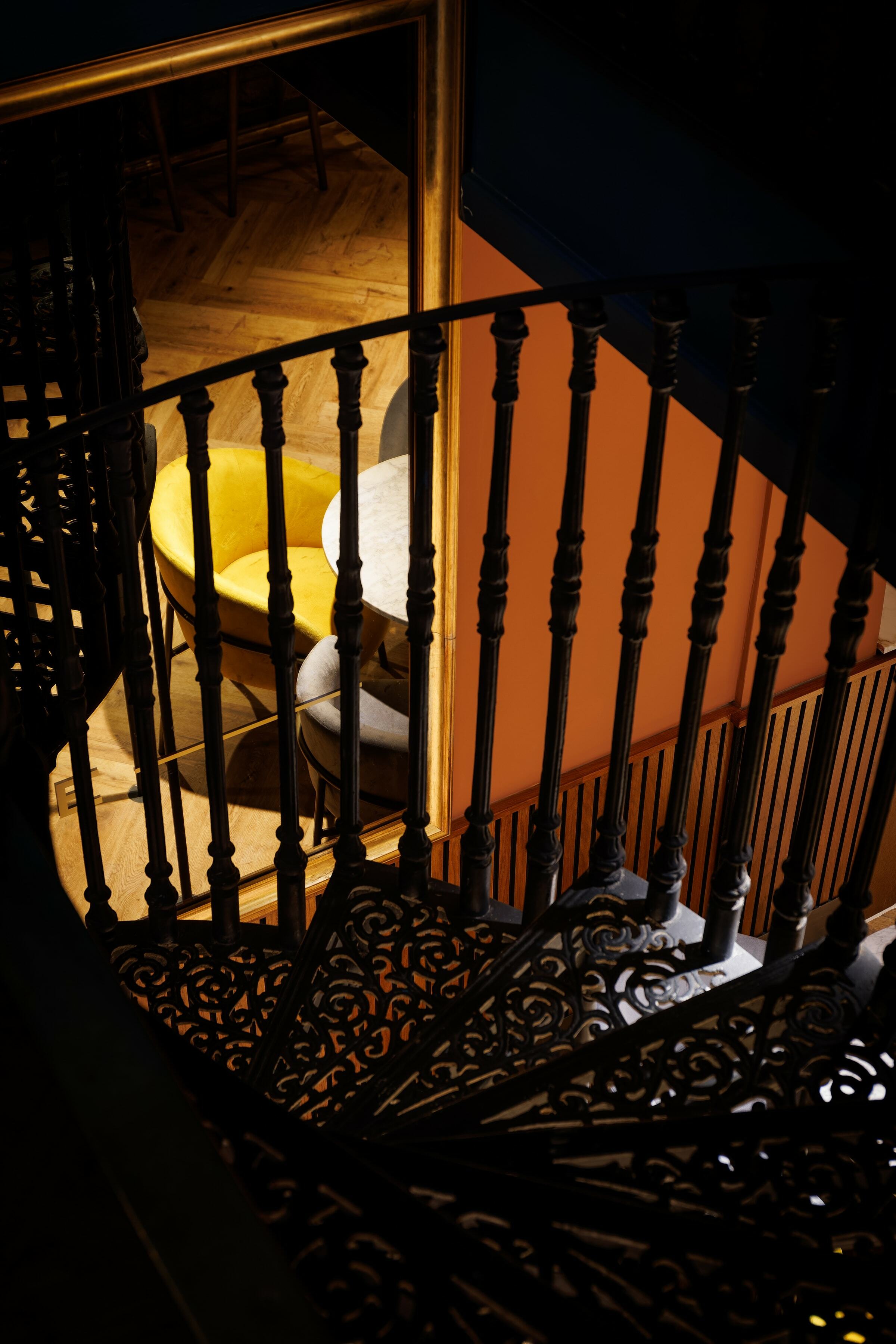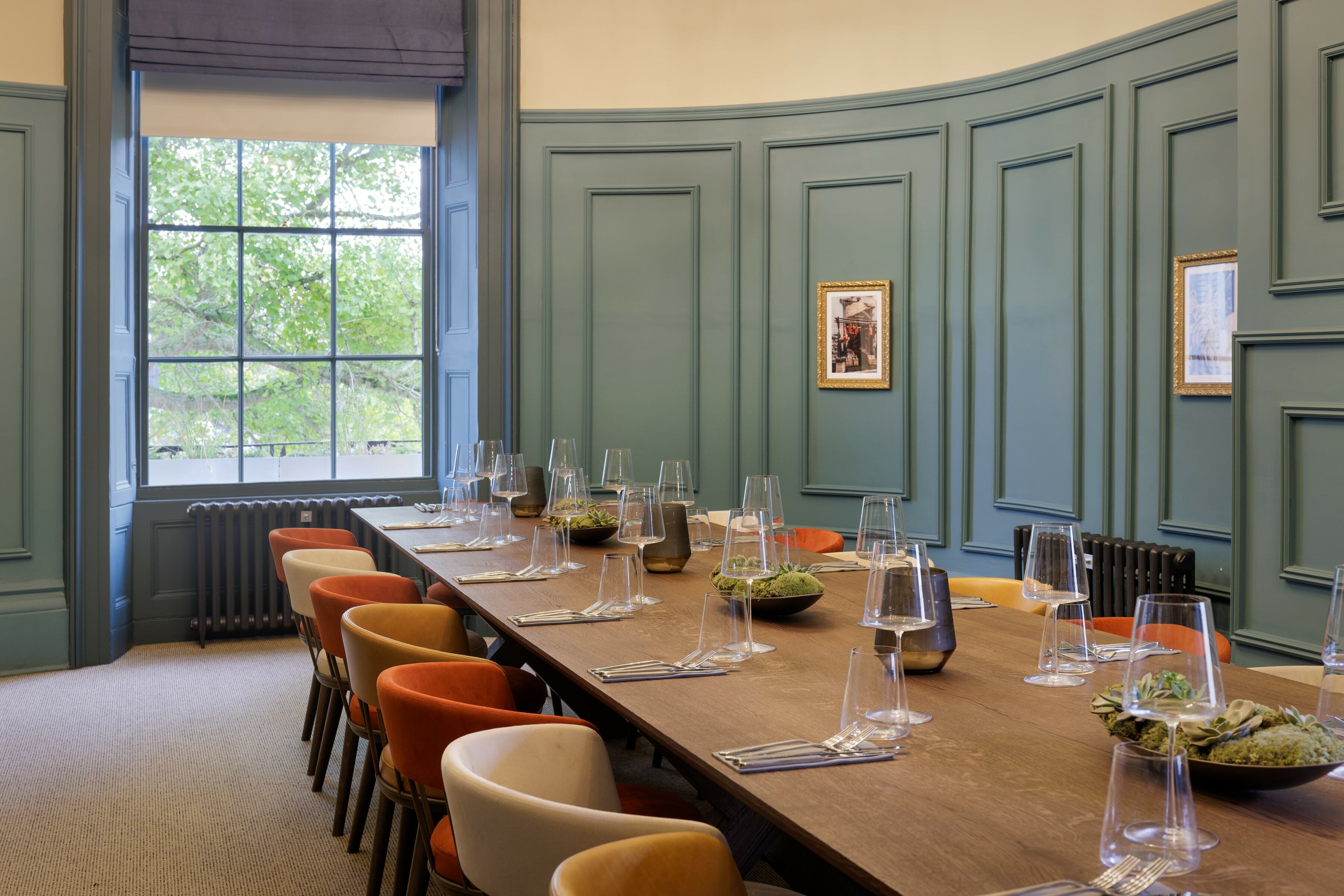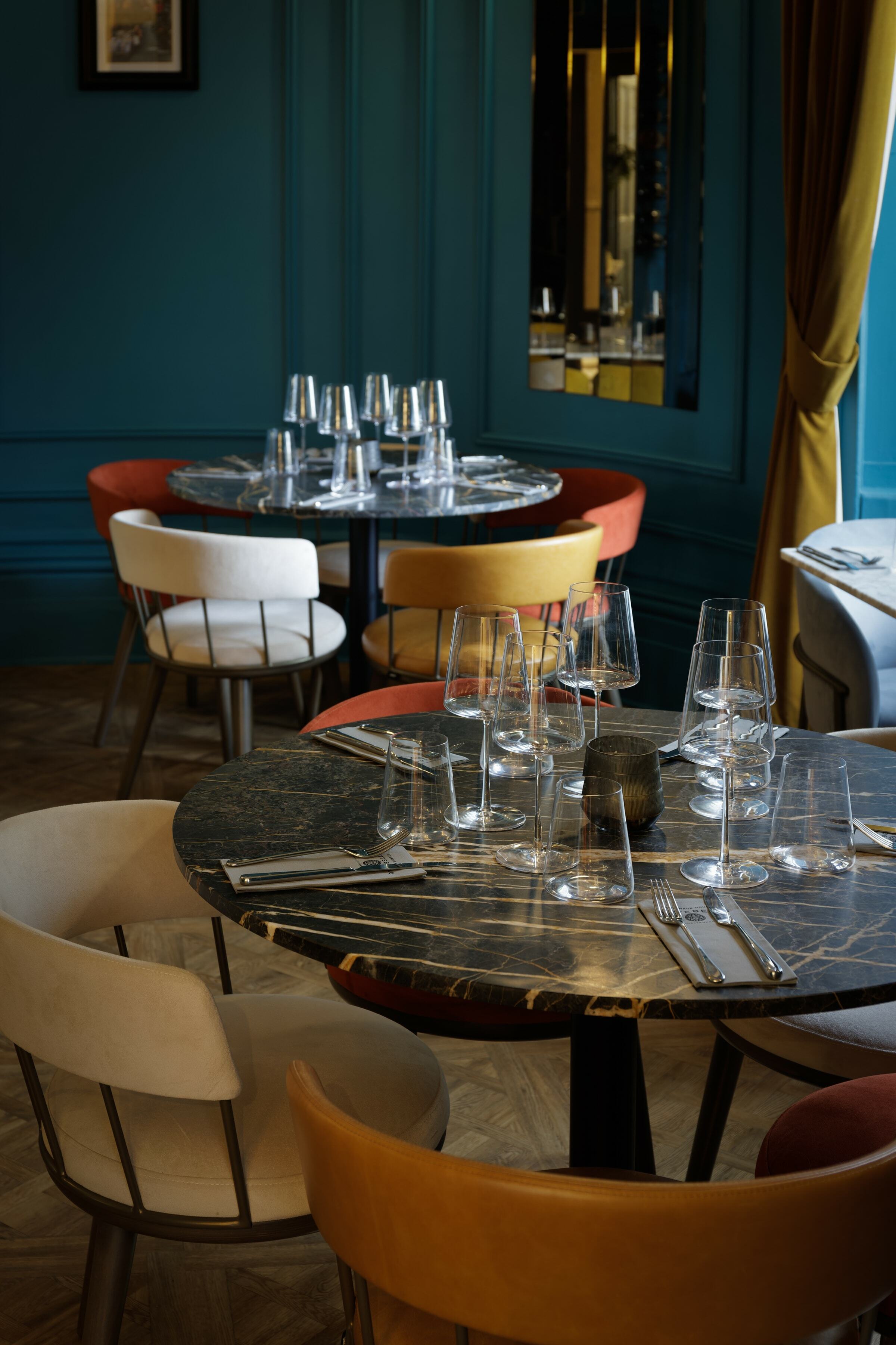 On the top floor is The Imperiale, a gorgeous private dining room which can also be used for meetings. For the long table, we placed our Meru Armchair as before in the same colour palette as the main dining space. It's a fantastic result against the backdrop of the blue walls.